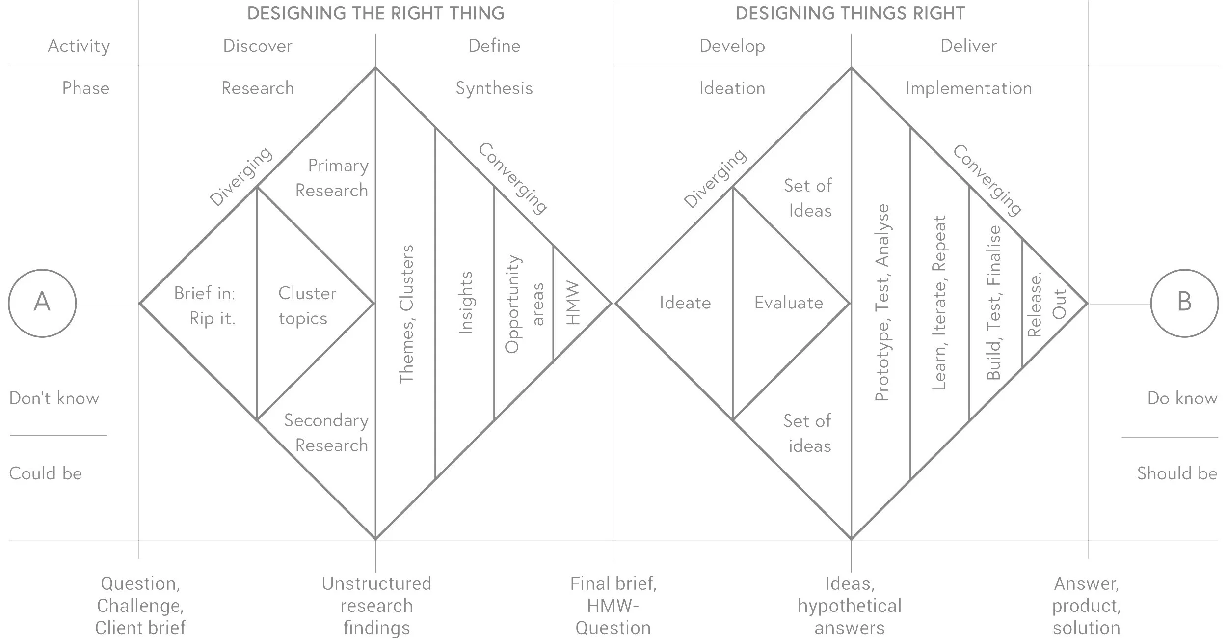 The official double diamond design model has four stages: Double diamond is a design process model developed in 2005 by the british design council. Avoid solving the wrong problem without the proper research, we can't know broaden our perspective the design methods applied during each phase encourage us to collect input from outside the product and design teams. We use the double diamond structure to understand customers and their problems and explore creative and innovative ways to solve their problems and delight them. In 2005, the british design council created the process mode to describe the work that designers were doing.
